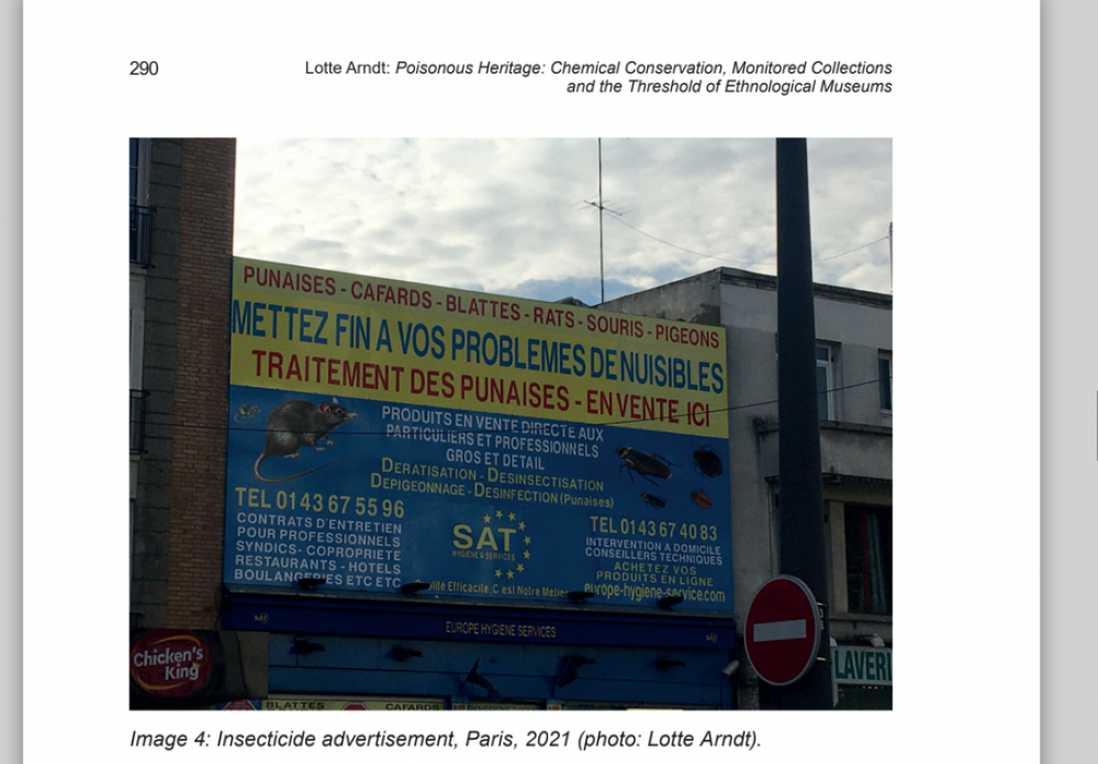 Many of the artifacts collected during the peak of colonization are made from organic materials and vulnerable to being eaten by insects or decomposition from mould. As part of the technical developments of the twentieth century, chemical treatments seemed to provide a viable solution to prevent decay of many collections. A broader awareness of the long-term effects of the employed toxic substances arose only decades later. Based on existing research, and explorative interviews in half a dozen museums in Europe, this text draws connections between the history of colonial collections, the use of chemicals in museum conservation, and the questions raised by shifting conceptions of the role of museums in the light of restitution and access-provision.