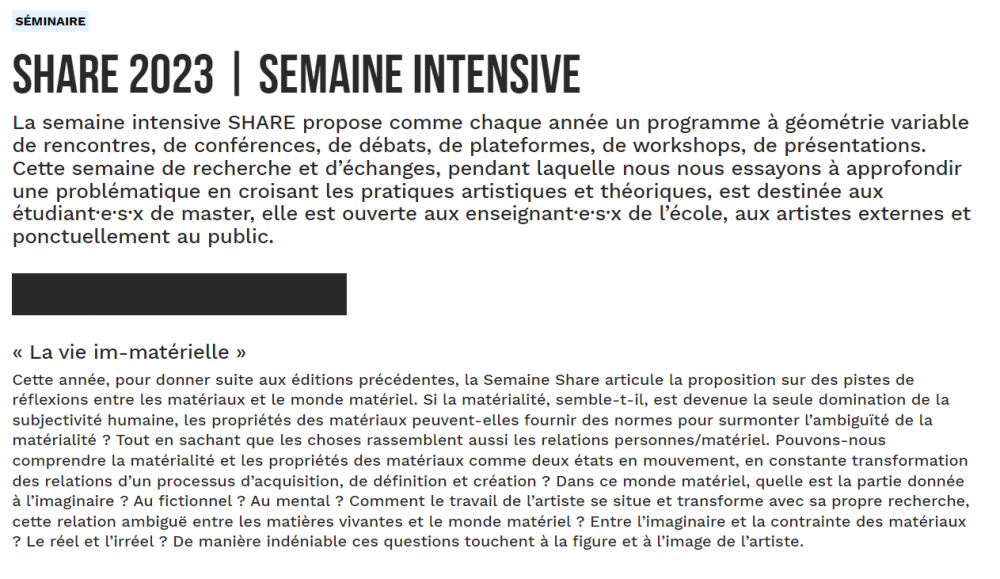 This year, as a follow-up to previous editions, Share Week articulates the proposal on lines of thought between materials and the material world. If materiality, it seems, has become the sole dominance of human subjectivity, can the properties of materials provide norms to overcome the ambiguity of materiality? While knowing that things also gather people/material relations. Can we understand materiality and material properties as two states in motion, in constant transformation of the relations of a process of acquisition, definition and creation? In this material world, what part is given to the imaginary? To the fictional? To the mental? How the work of the artist is situated and transforms with his own research, this ambiguous relation between the living matters and the material world? Between the imaginary and the constraint of materials? The real and the unreal? In an undeniable way these questions touch the figure and the image of the artist.